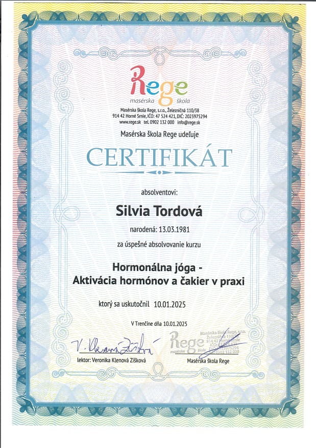 – Tradičnej čínskej medicíny (2017-2021), ale mnohých ďalších hlbších vzdelávaní z oblasti TČM, ktoré už dávno nepočítam (aurikuloterapia, iridológia, astrológia, byliny, su jok, lymfa, hormonálna joga, Dornova terapia, …)